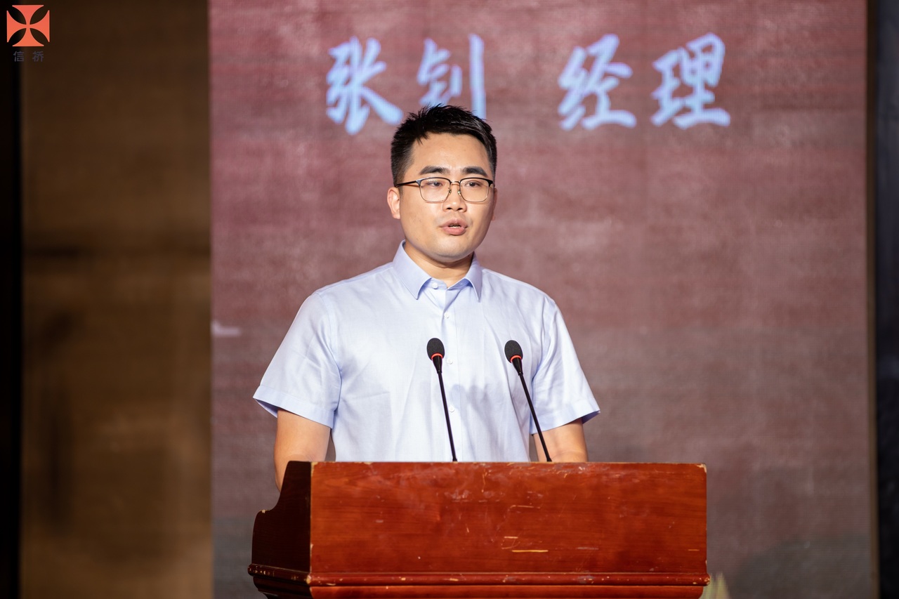 員工代表張釗講話,他代表了中青一代的信橋人,感慨了信橋二十幾年的發(fā)展,感謝信橋給予他的財(cái)富和能力。